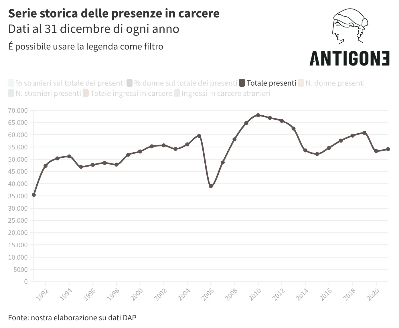 - “Un Anno in Carcere - Quattordicesimo Rapporto Sulle Condizioni Di Detenzione a Cura Di Associazione Antigone.” n.d. Un Anno in Carcere - XIV Rapporto Sulle Condizioni Di Detenzione a Cura Di Associazione Antigone. Accessed May 5, 2023. link. “Numeri.” 2022. XVIII Rapporto Sulle Condizioni Di Detenzione. April 27, 2022. link.